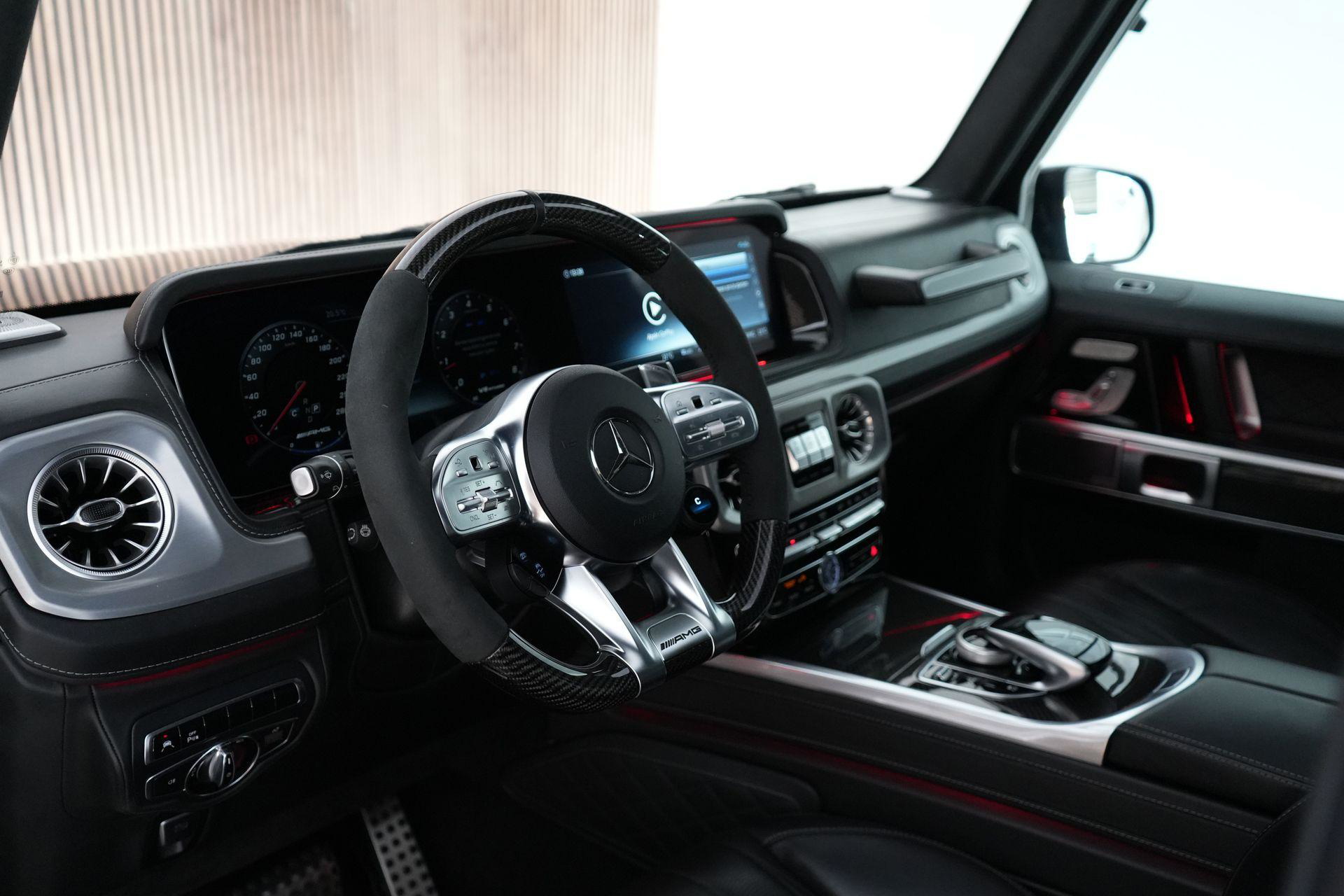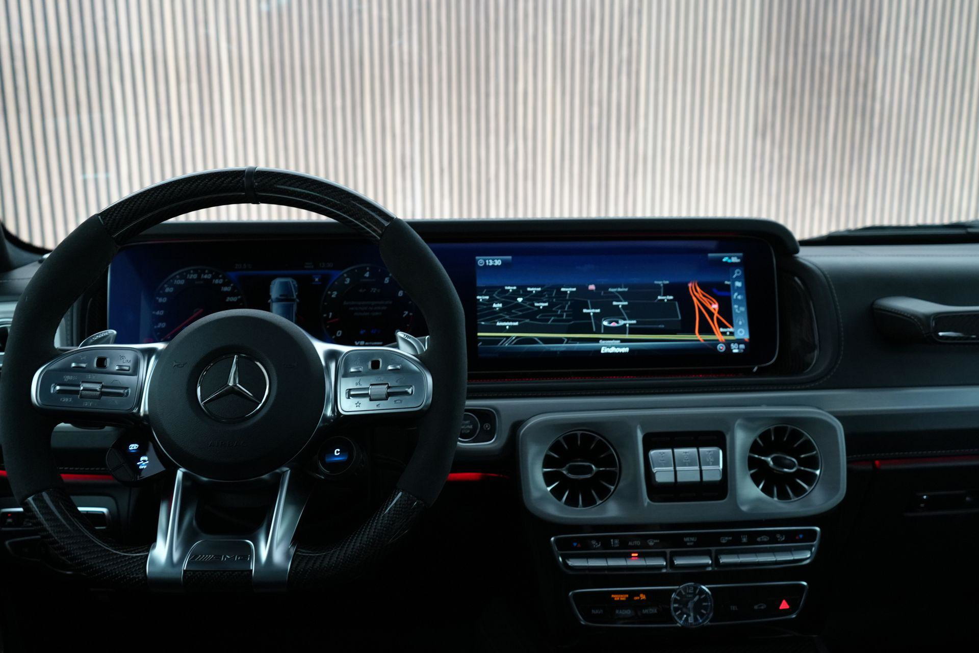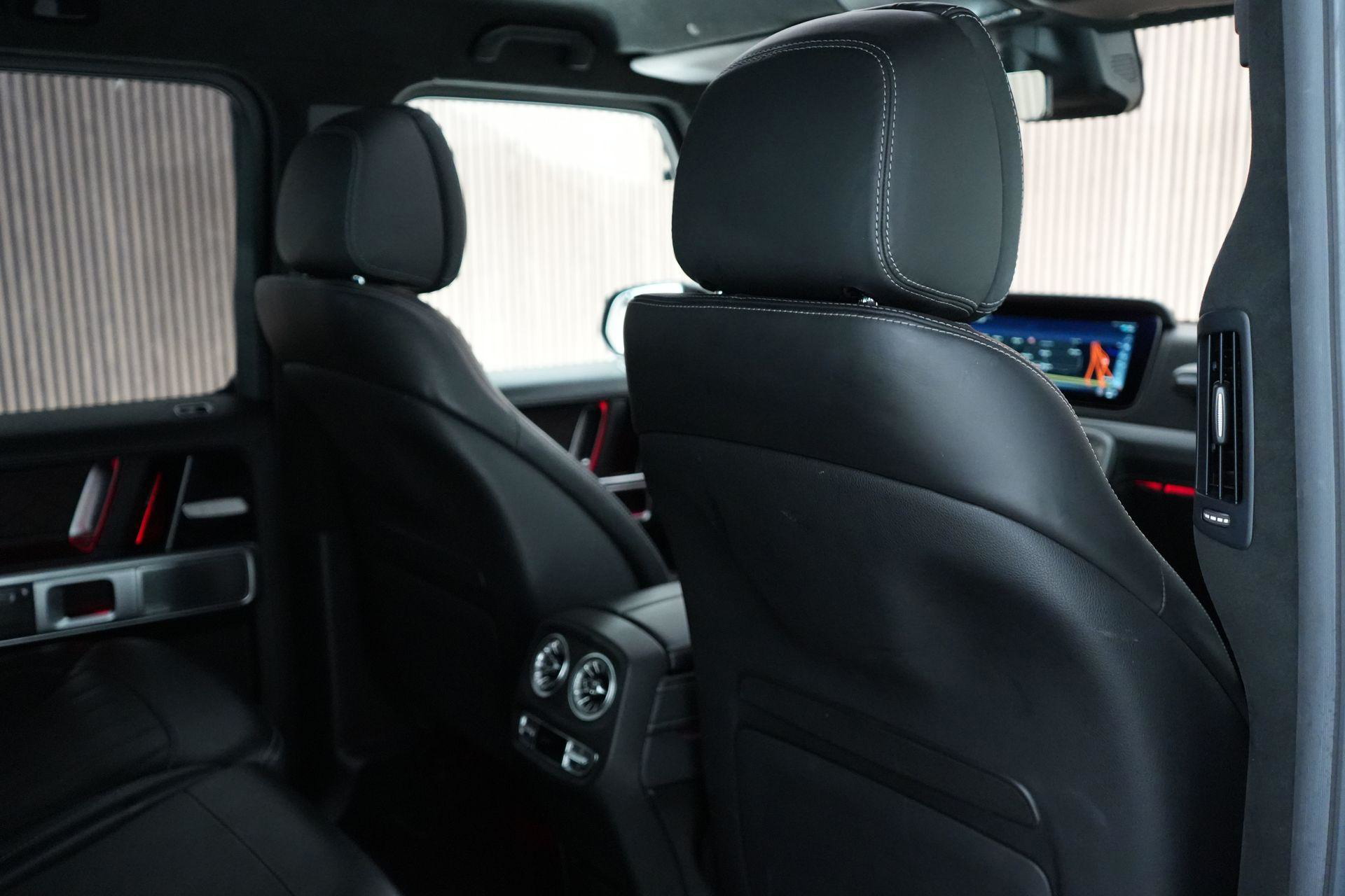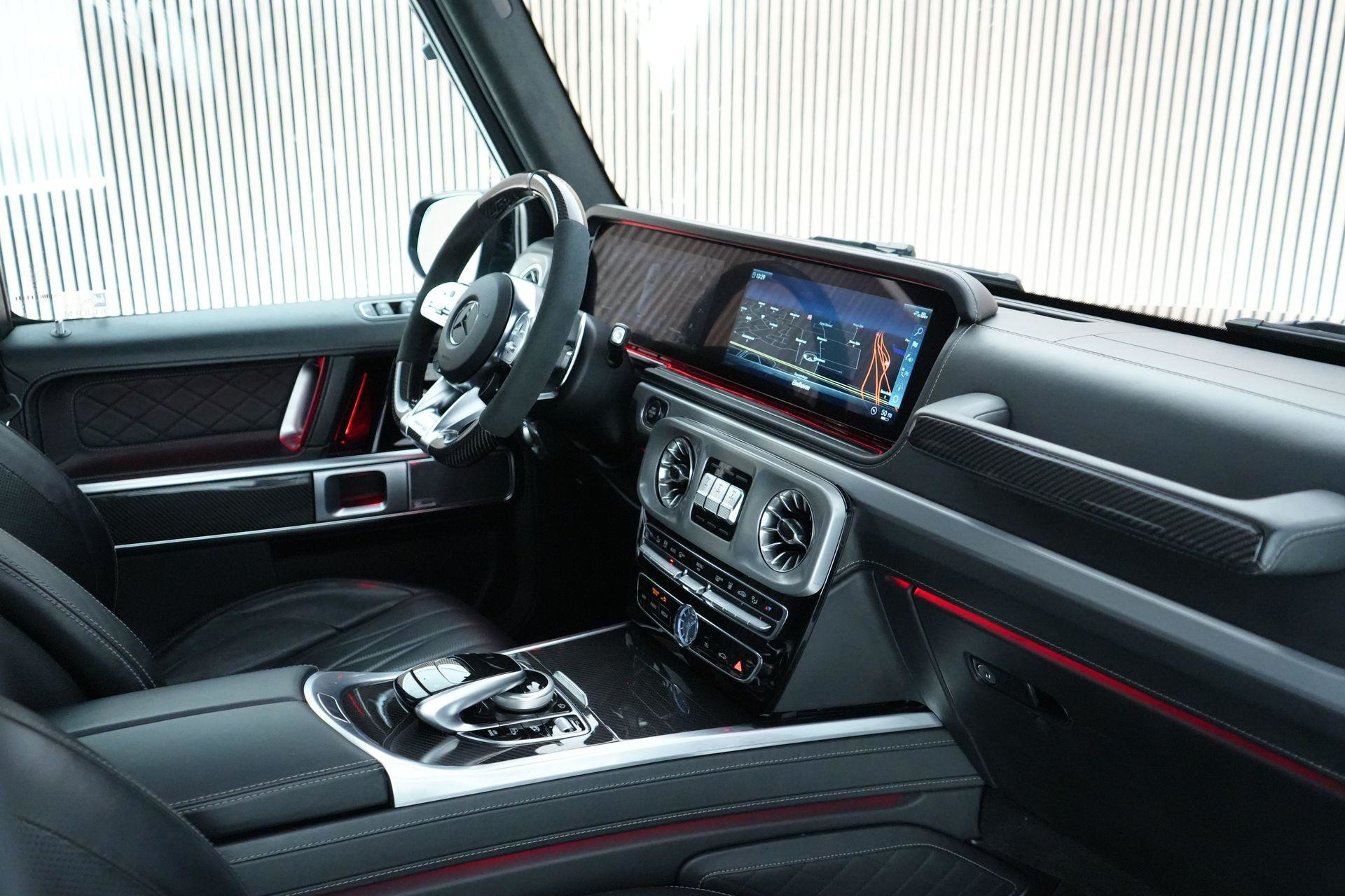 Deze G63 is ook gewoon goed uitgevoerd. Volledig nappaleder interieur, Burmester soundsysteem, panoramadak, ambient lighting en een digitaal display. Stoelcomfortpakket, verwarmd stuur, alles zit erop wat je dagelijks gebruikt.