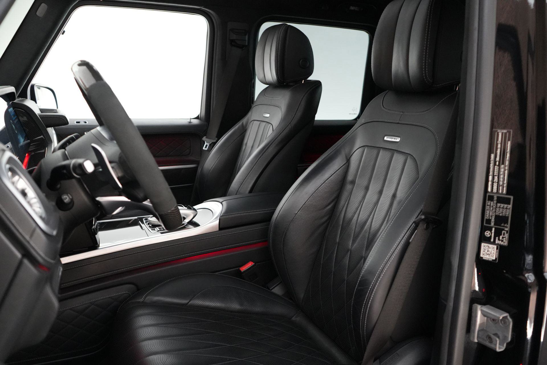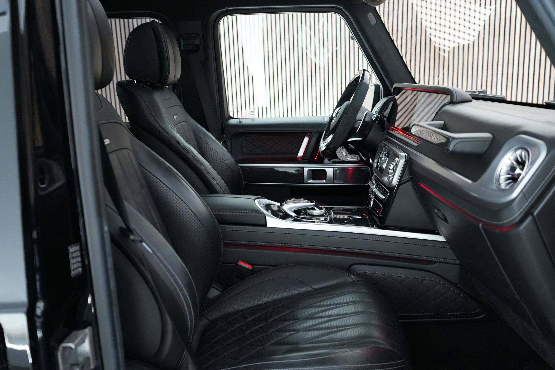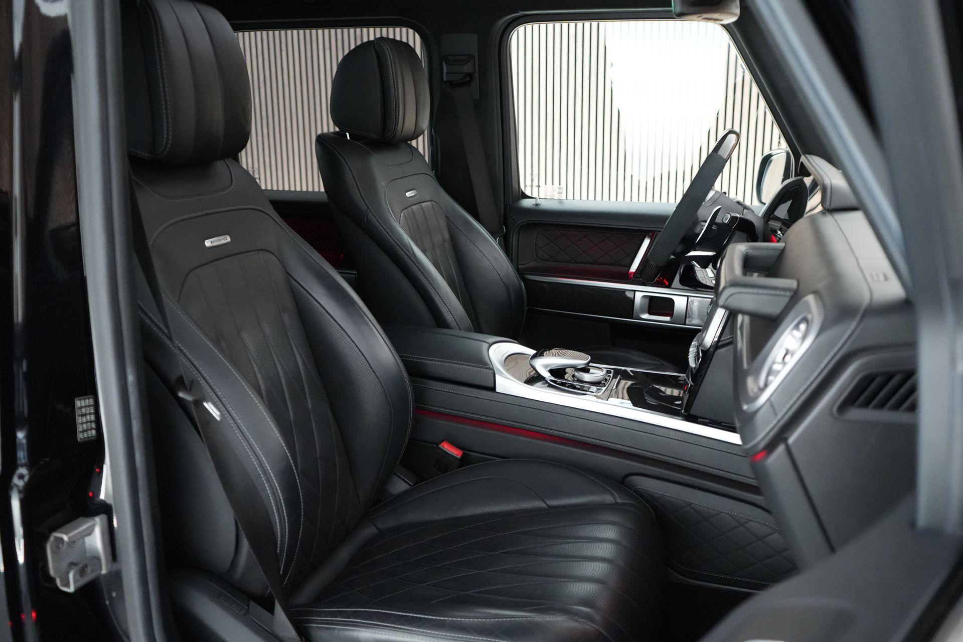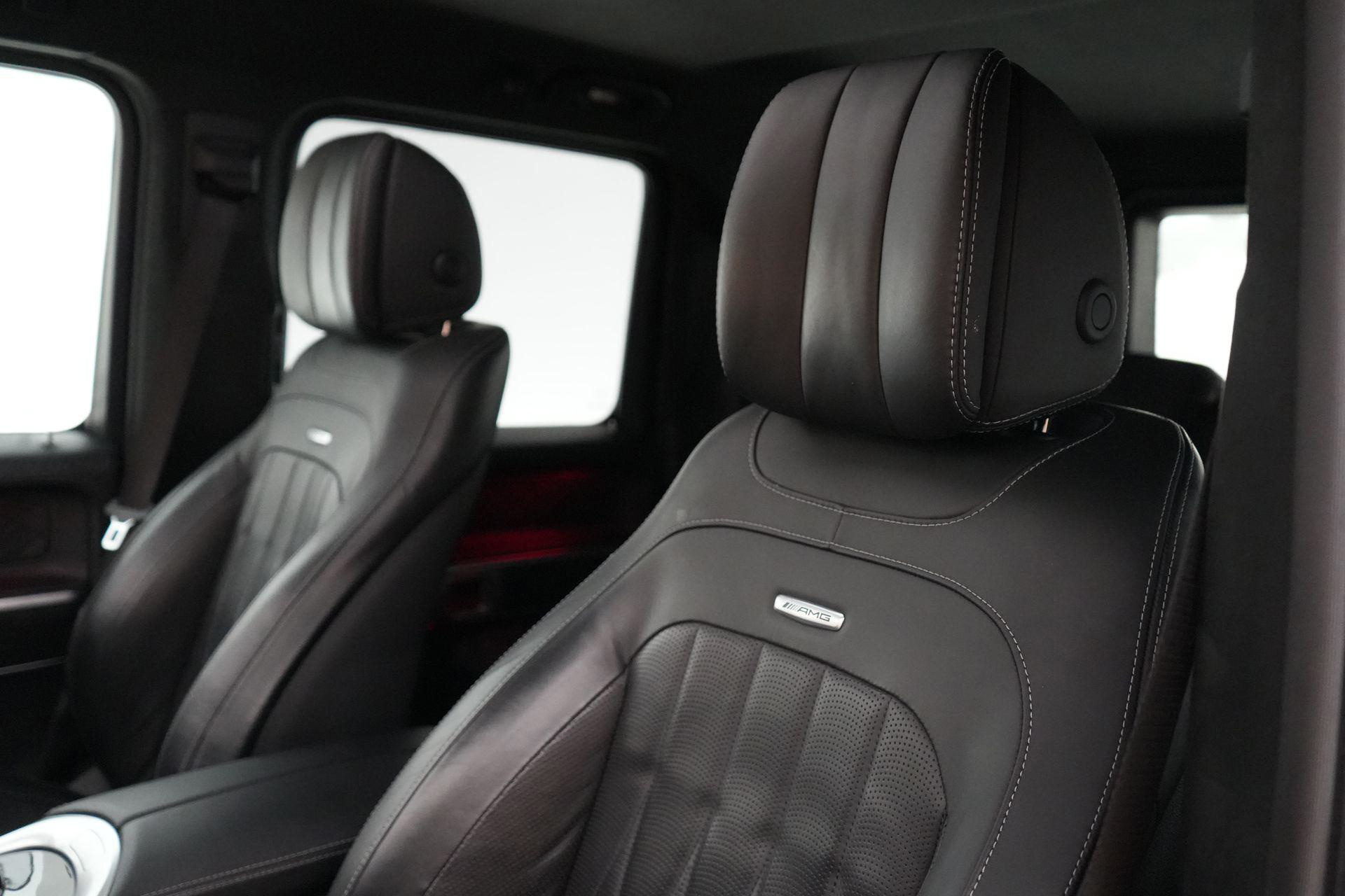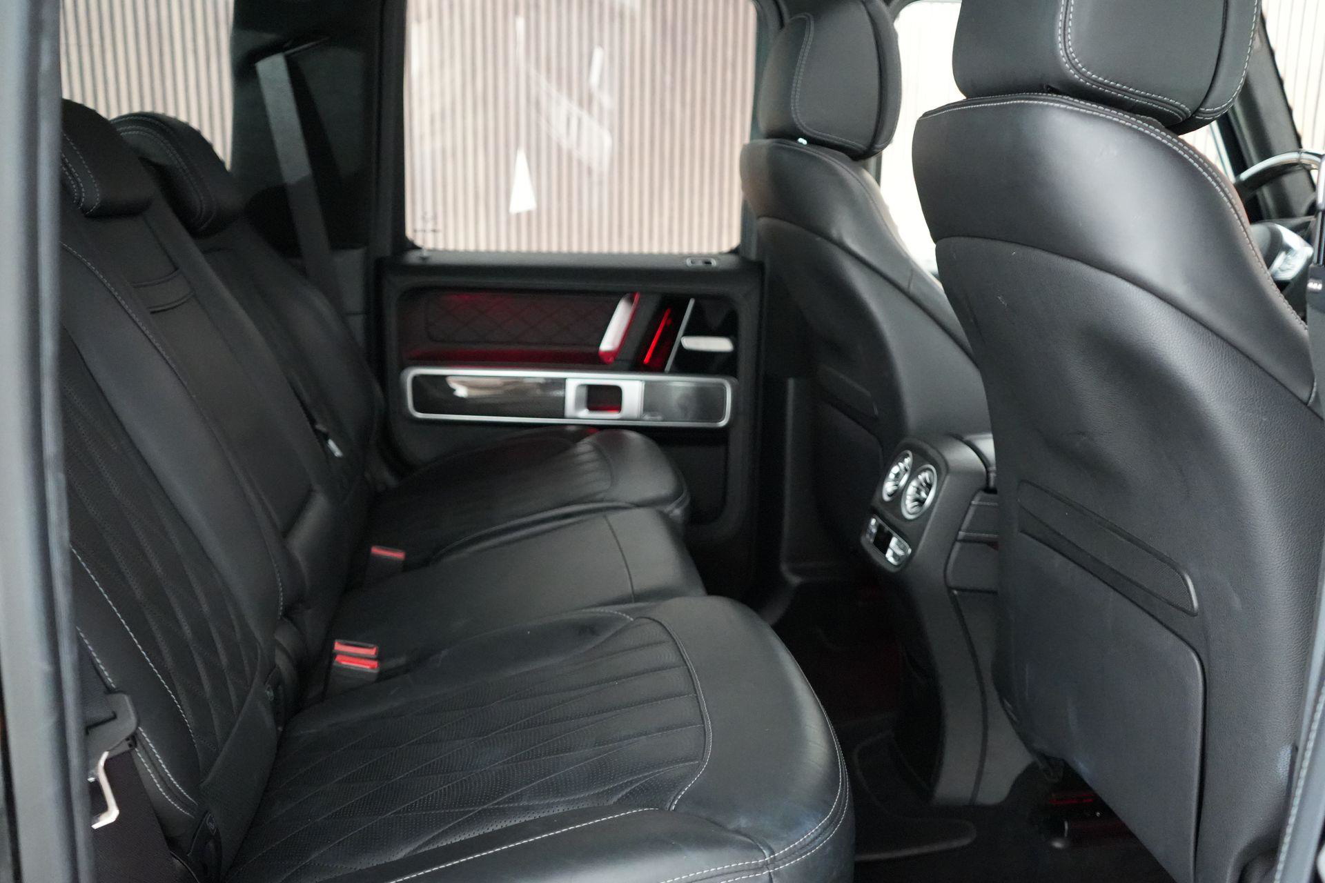 Deze G63 is ook gewoon goed uitgevoerd. Volledig nappaleder interieur, Burmester soundsysteem, panoramadak, ambient lighting en een digitaal display. Stoelcomfortpakket, verwarmd stuur, alles zit erop wat je dagelijks gebruikt.