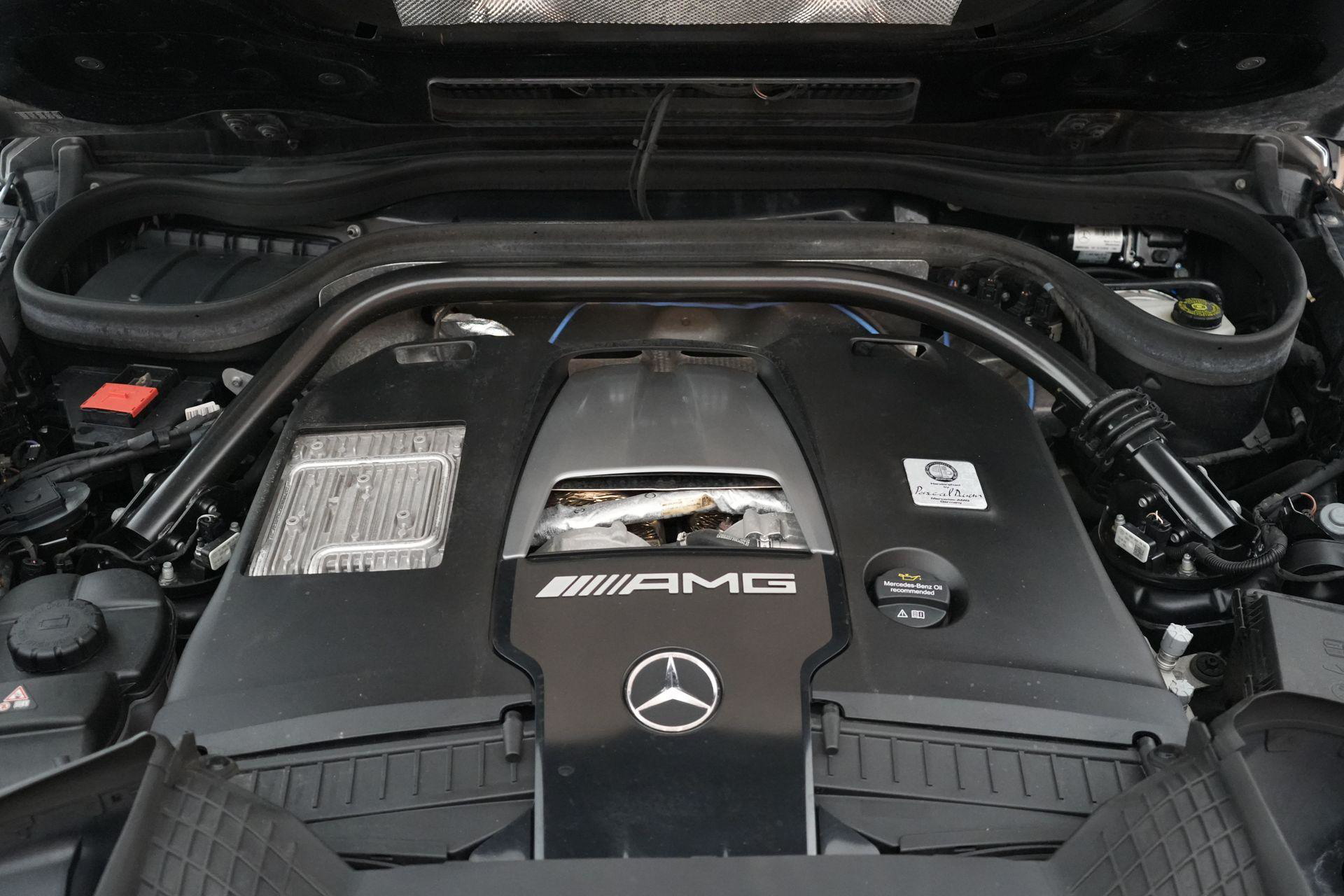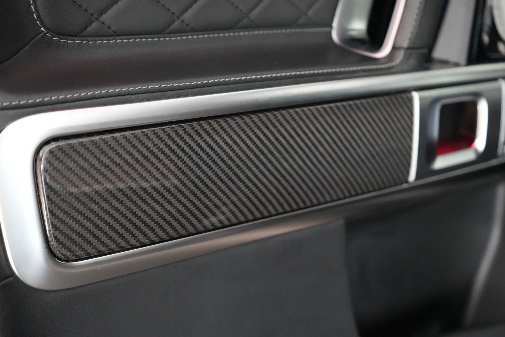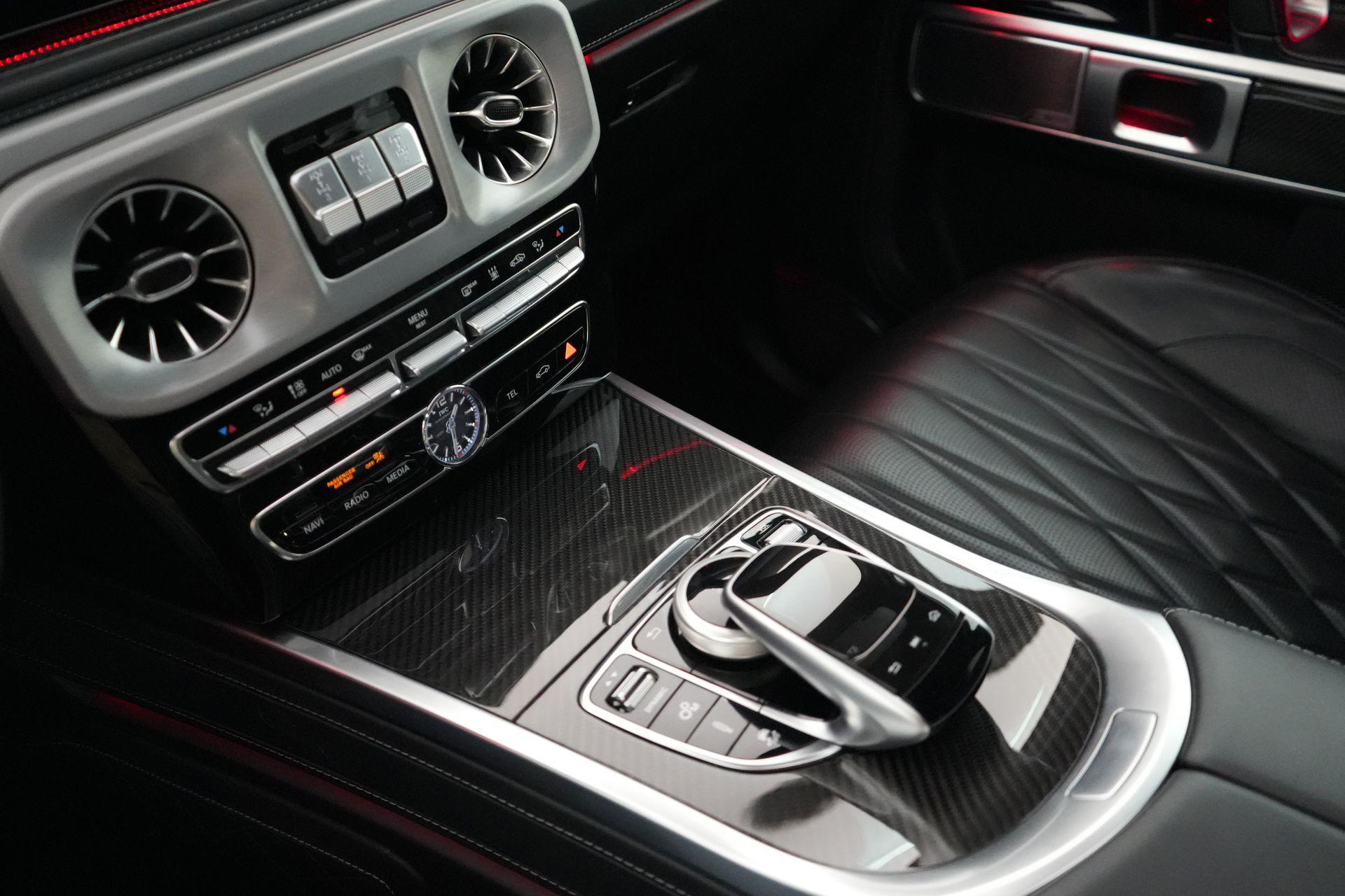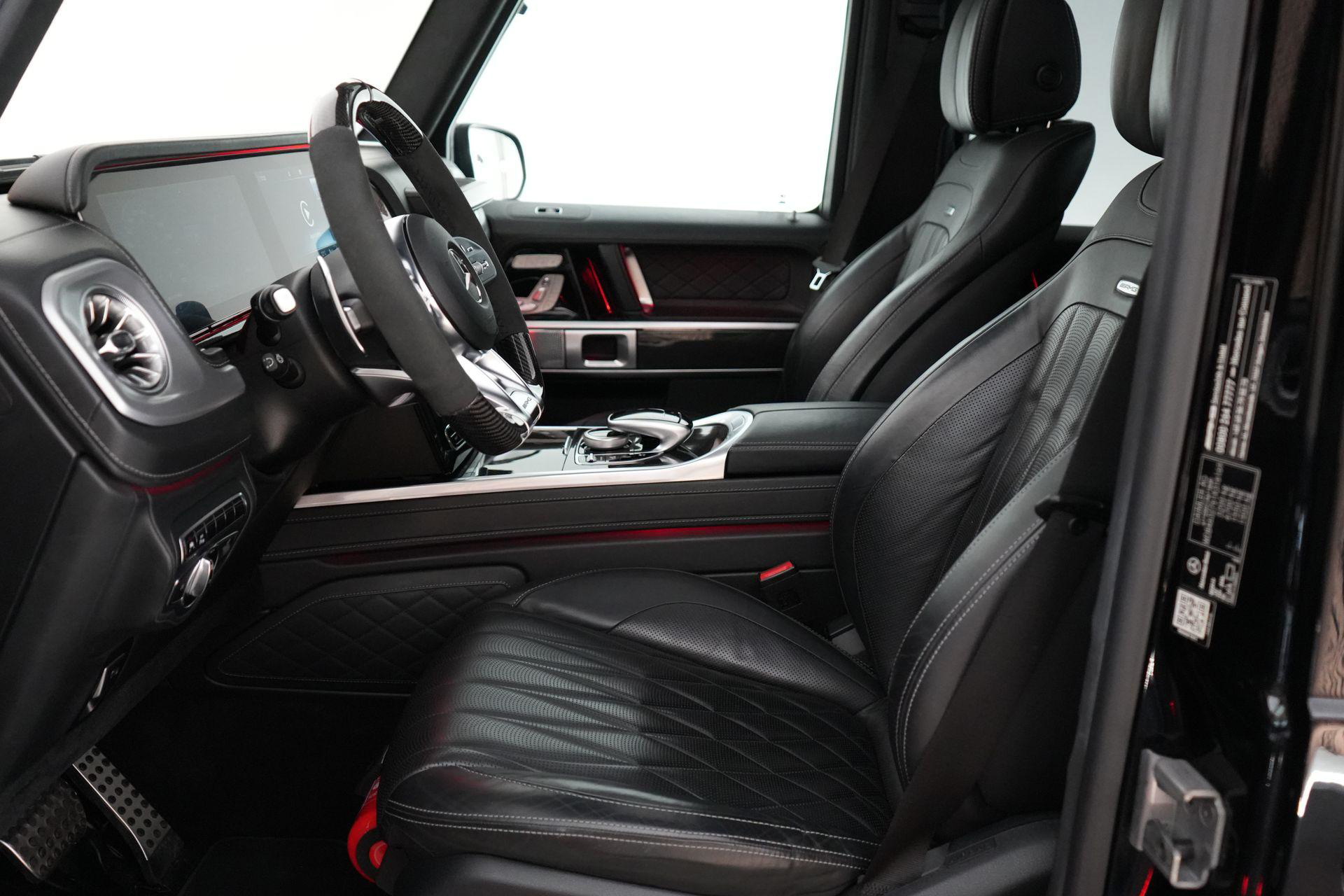 Deze G63 is ook gewoon goed uitgevoerd. Volledig nappaleder interieur, Burmester soundsysteem, panoramadak, ambient lighting en een digitaal display. Stoelcomfortpakket, verwarmd stuur, alles zit erop wat je dagelijks gebruikt.