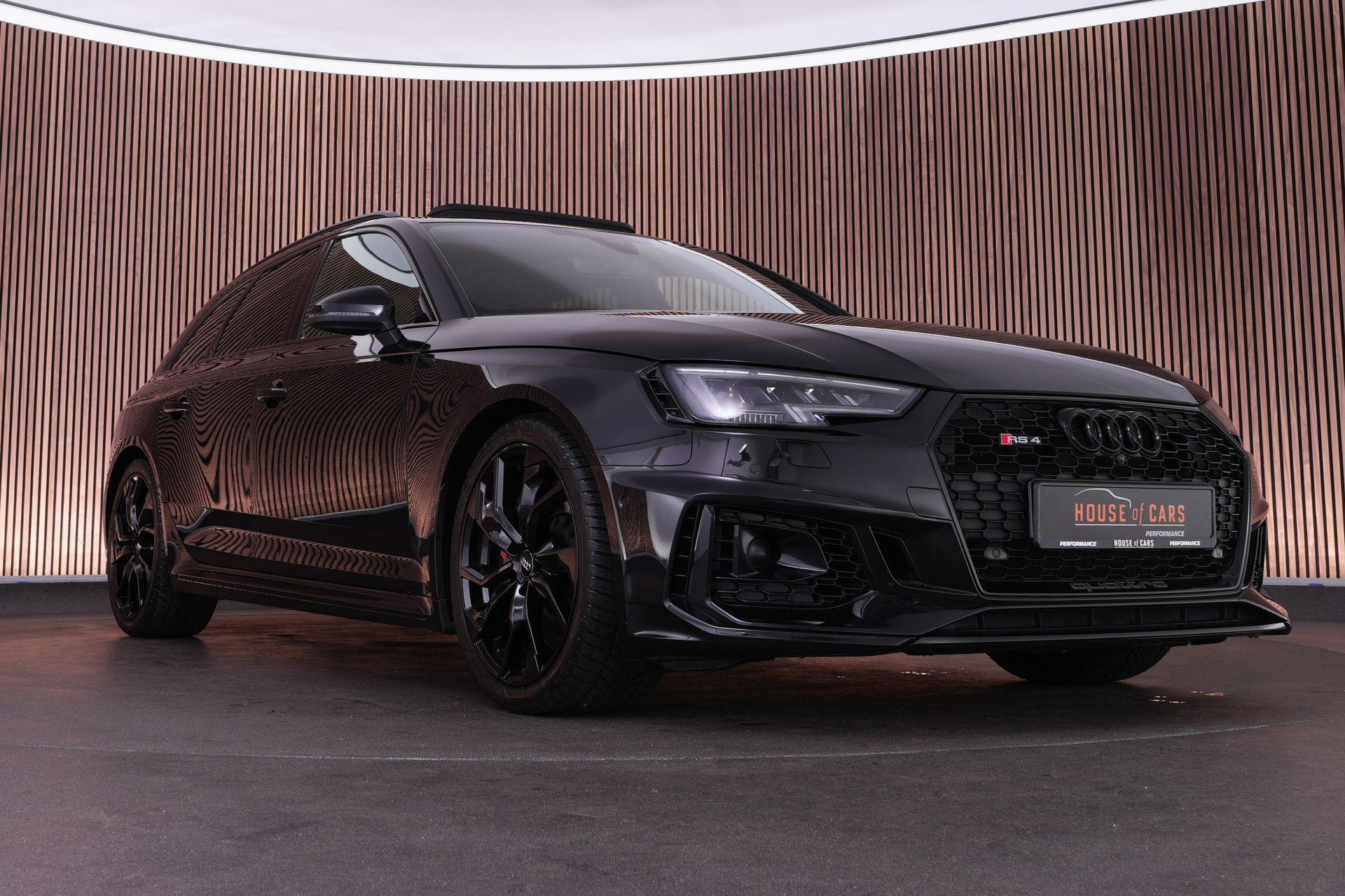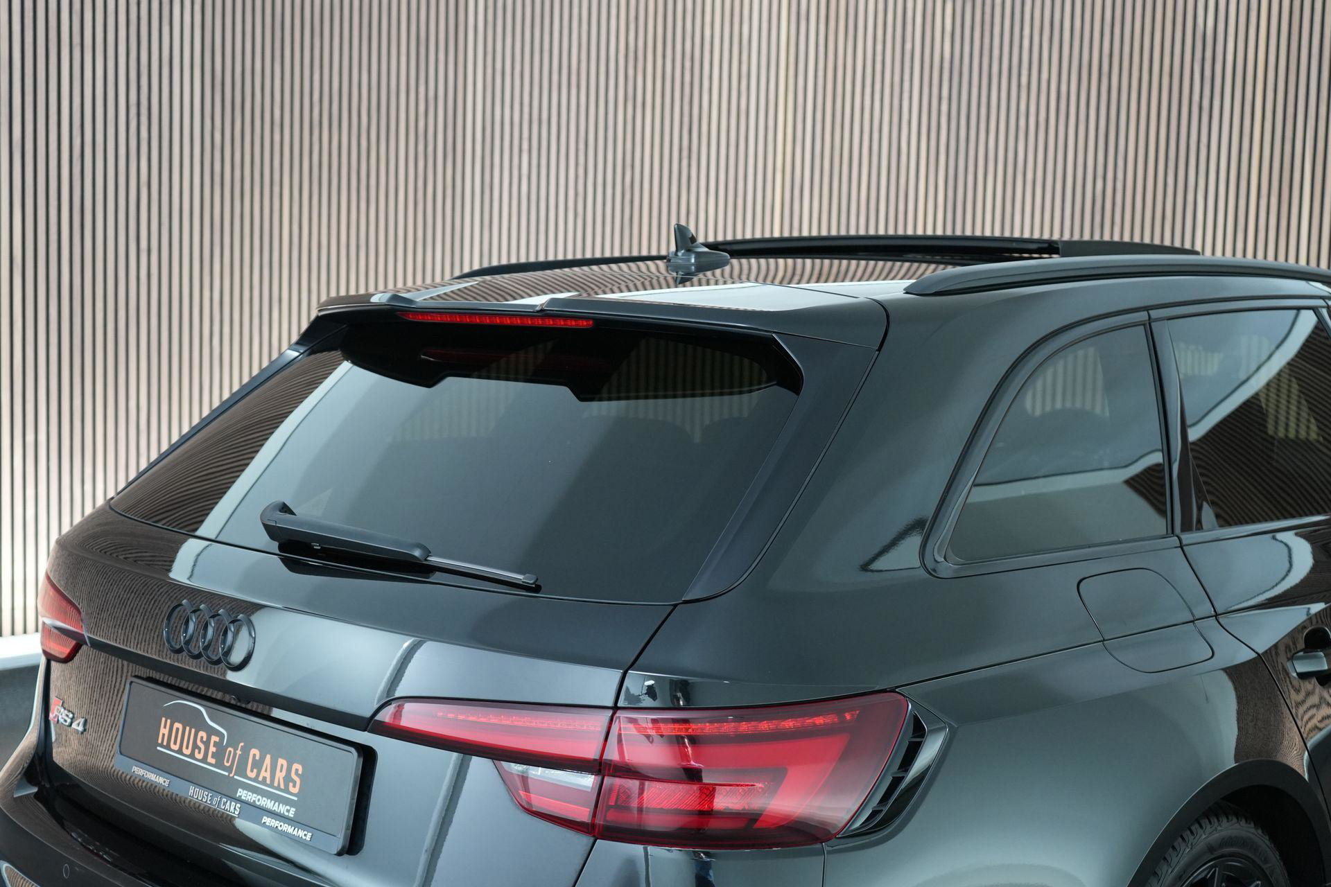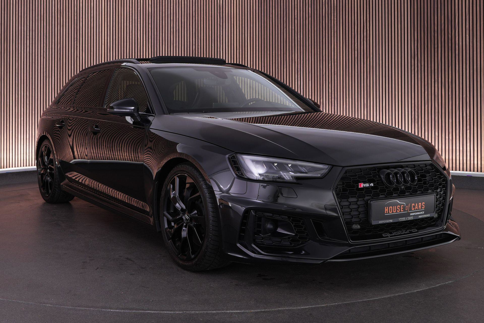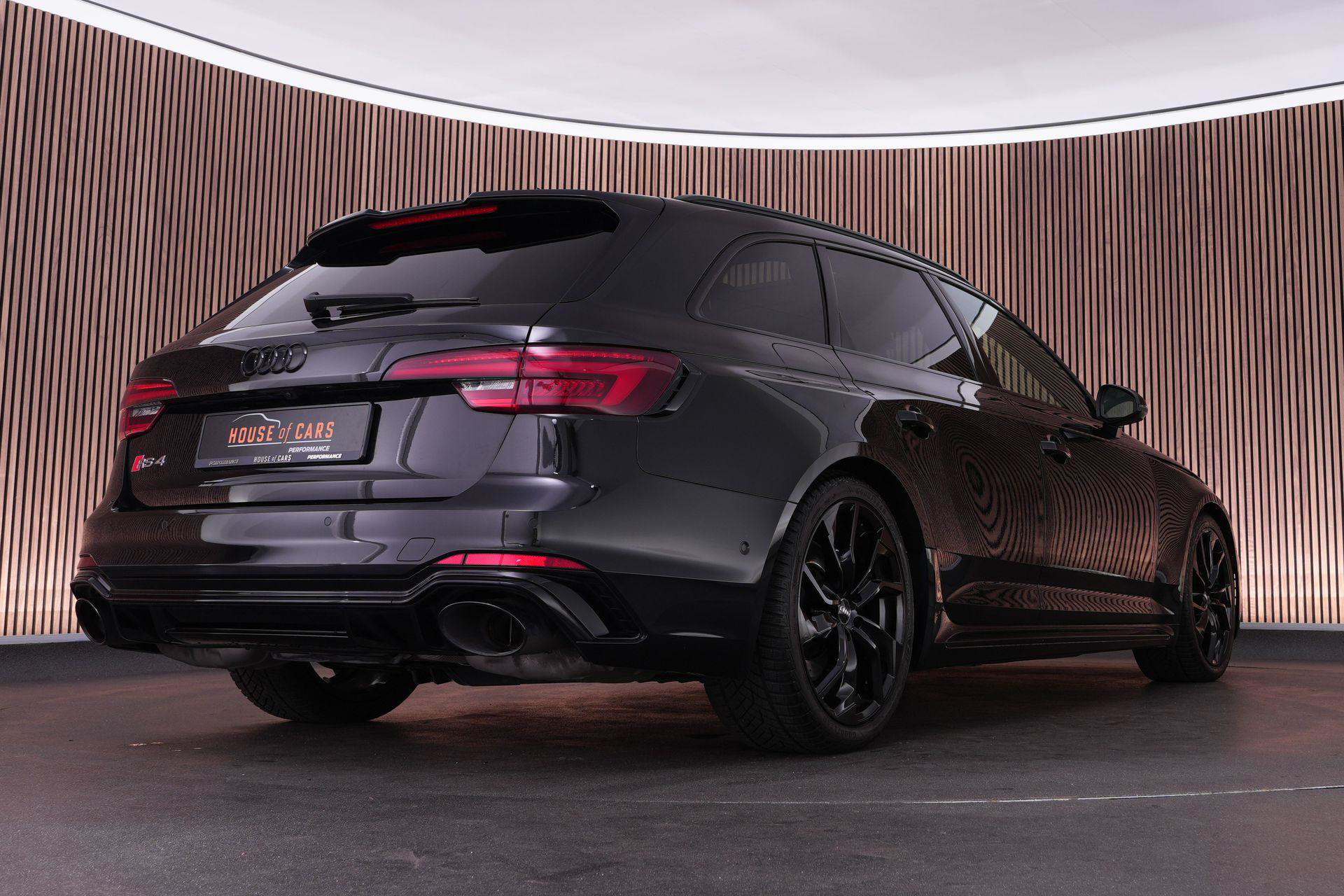 Audi RS4 Avant 2.9 TFSI quattro uit 2019 in Mythoszwart metallic. Een auto die alles in huis heeft: de ruimte en bruikbaarheid van een Avant, gecombineerd met het karakter en de prestaties die je van een echte RS verwacht. Dankzij de 2.9 biturbo V6, quattro-aandrijving en tiptronic automaat is dit een auto die onder alle omstandigheden indruk maakt, maar tegelijk ook comfortabel genoeg is voor dagelijks gebruik.