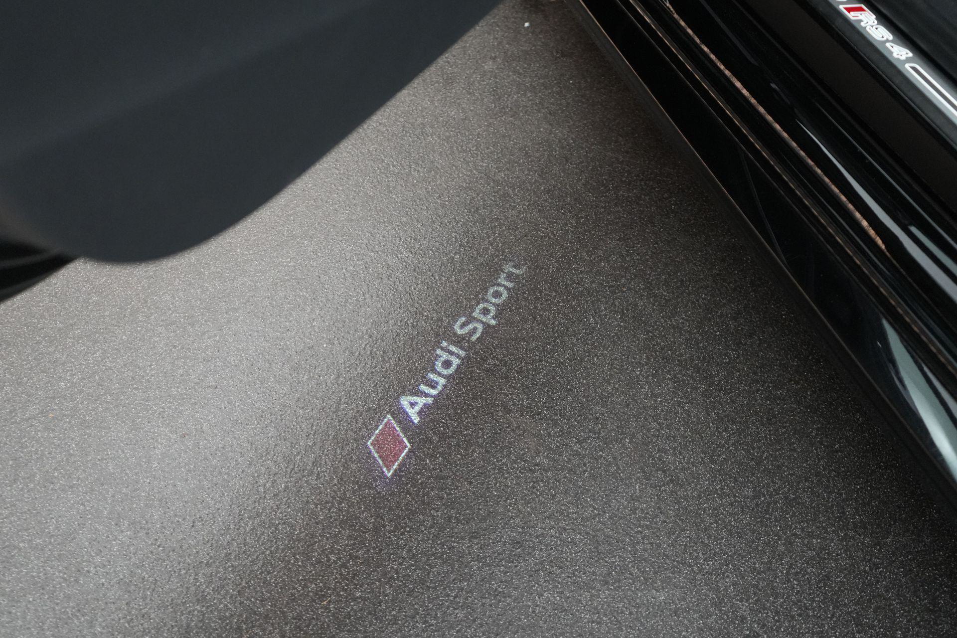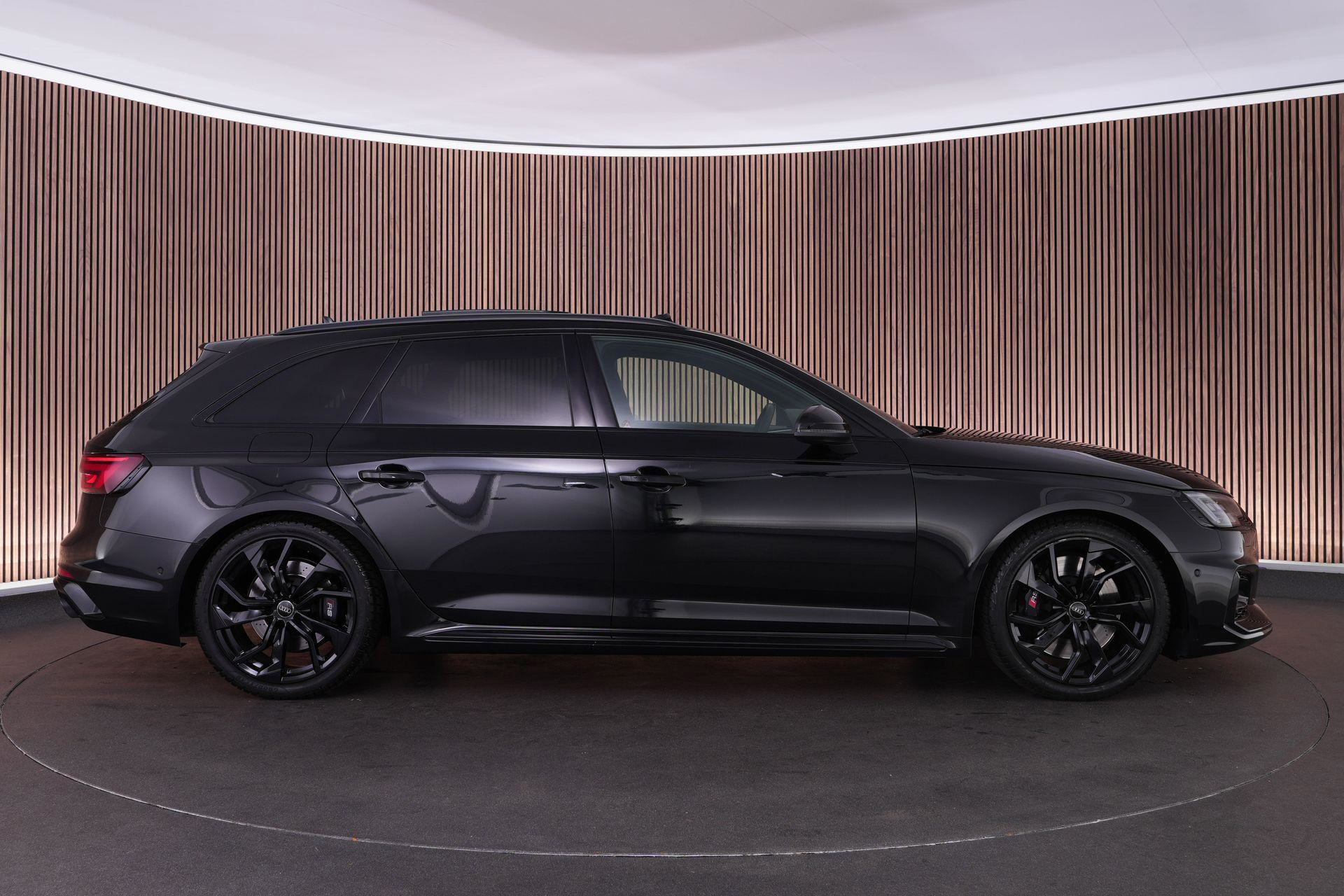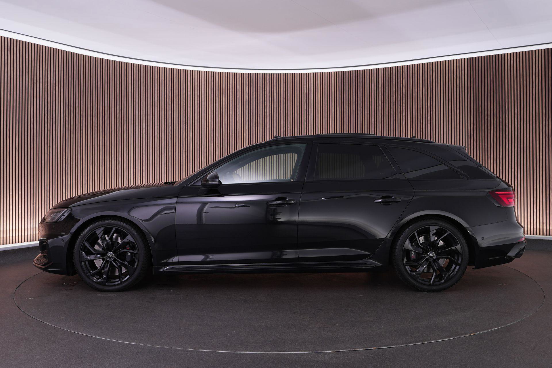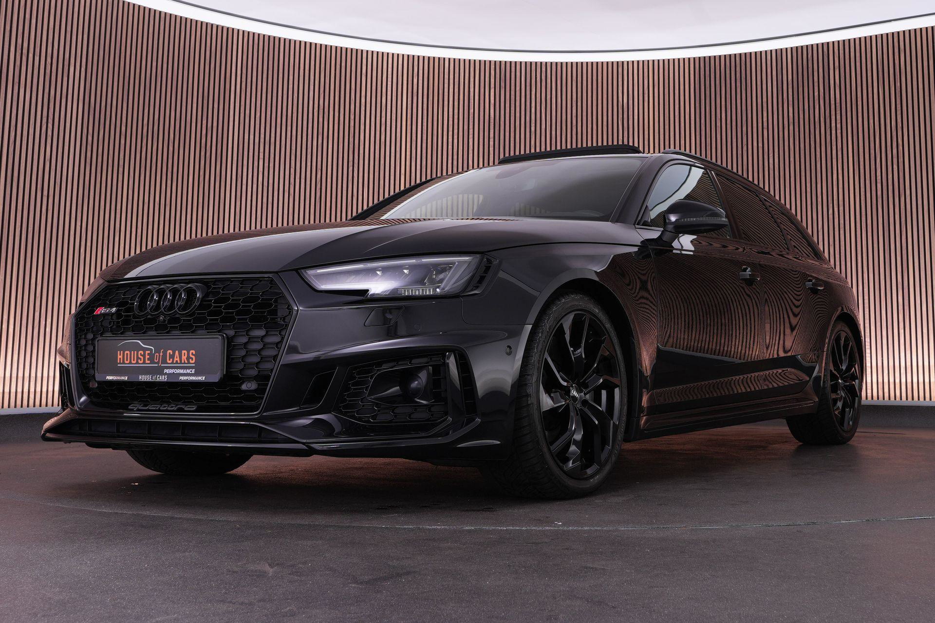 Audi RS4 Avant 2.9 TFSI quattro uit 2019 in Mythoszwart metallic. Een auto die alles in huis heeft: de ruimte en bruikbaarheid van een Avant, gecombineerd met het karakter en de prestaties die je van een echte RS verwacht. Dankzij de 2.9 biturbo V6, quattro-aandrijving en tiptronic automaat is dit een auto die onder alle omstandigheden indruk maakt, maar tegelijk ook comfortabel genoeg is voor dagelijks gebruik.