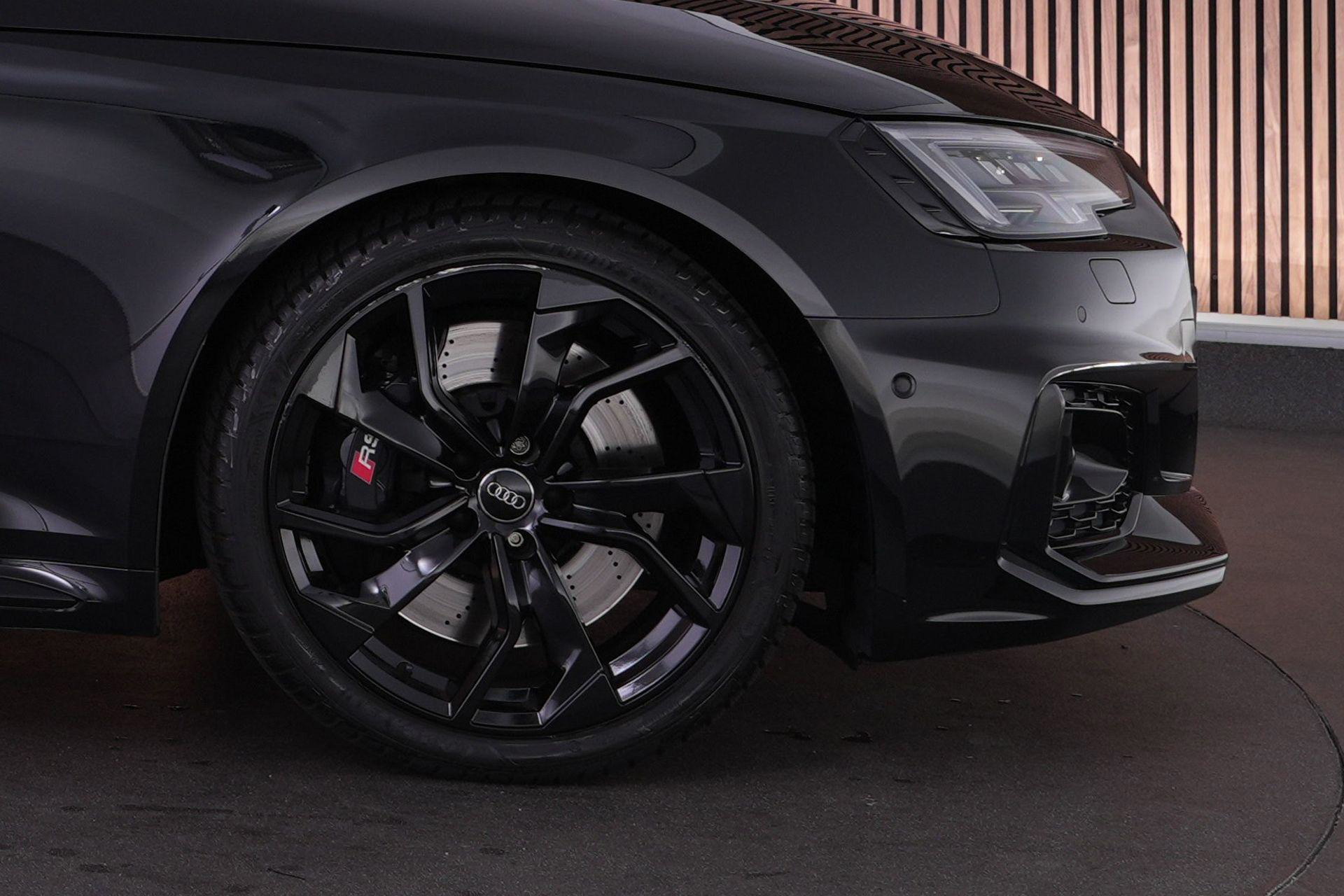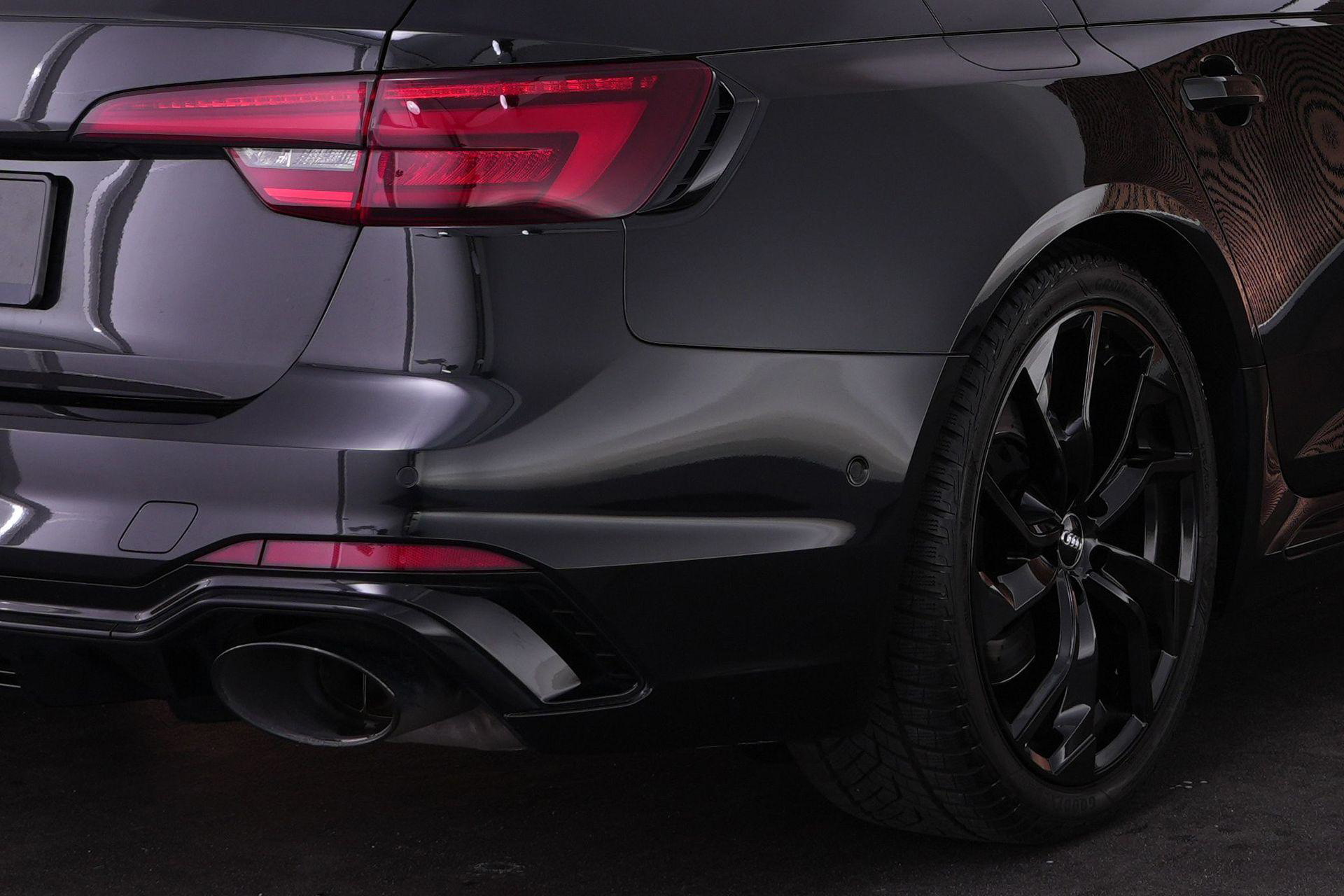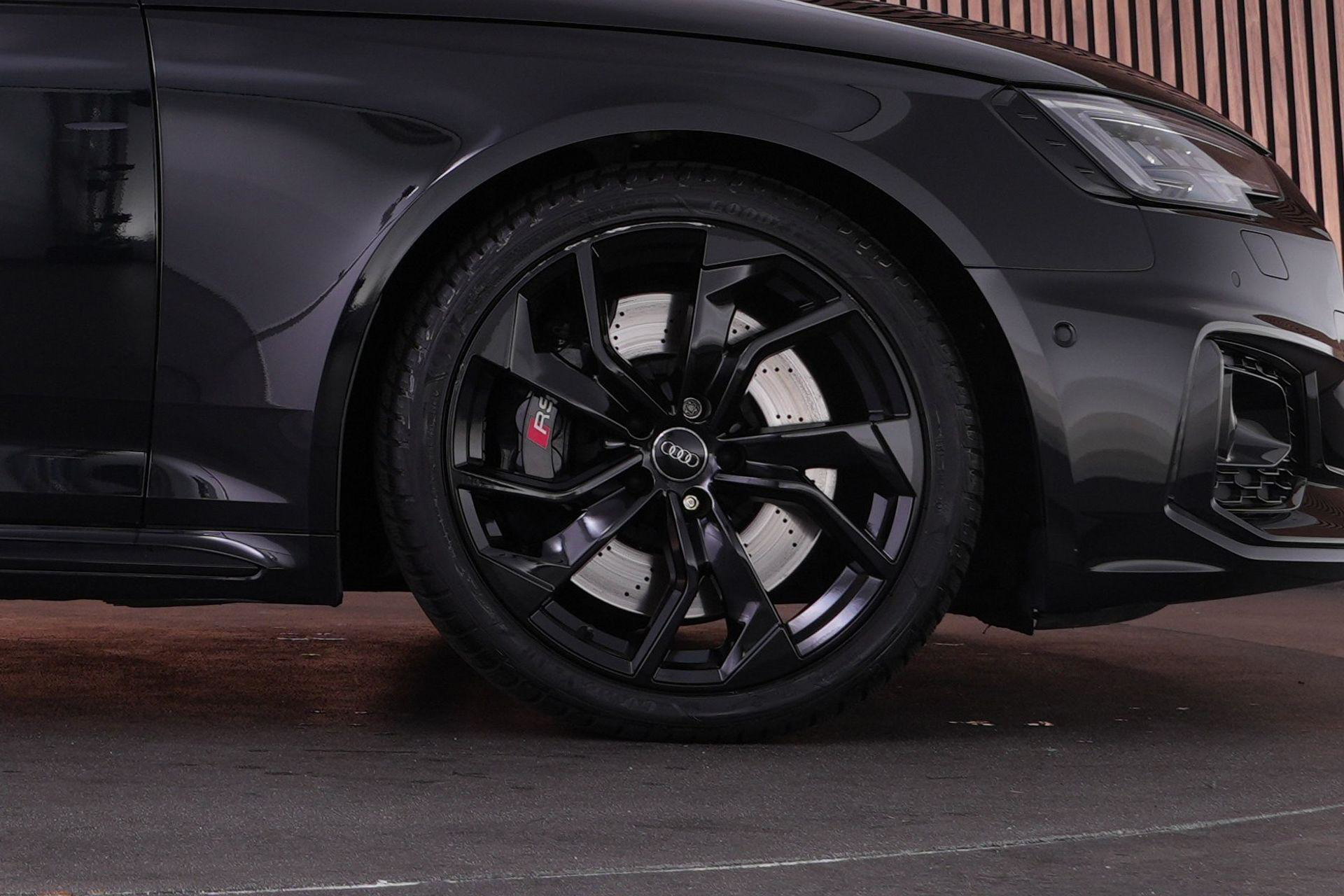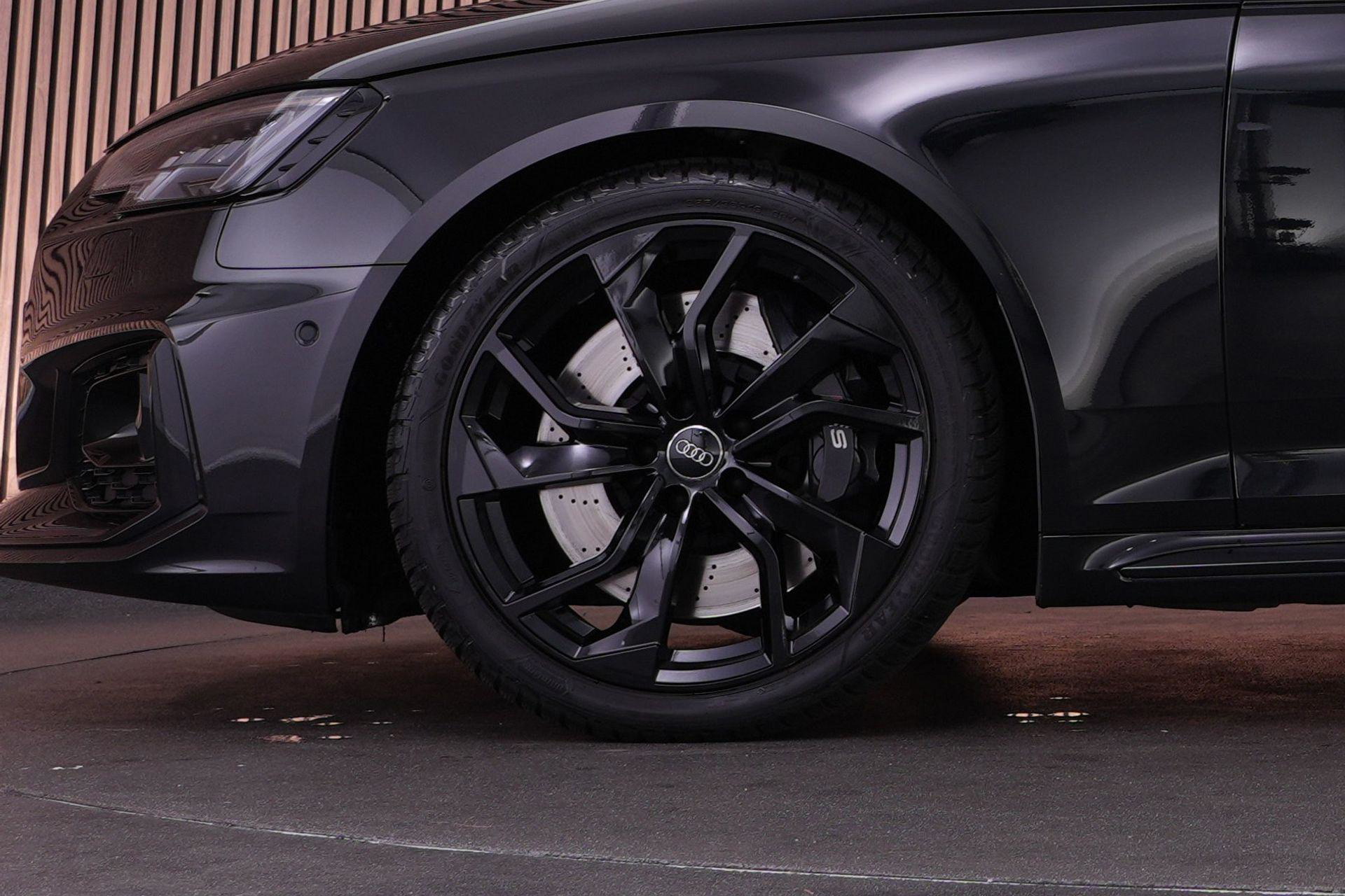 Audi RS4 Avant 2.9 TFSI quattro uit 2019 in Mythoszwart metallic. Een auto die alles in huis heeft: de ruimte en bruikbaarheid van een Avant, gecombineerd met het karakter en de prestaties die je van een echte RS verwacht. Dankzij de 2.9 biturbo V6, quattro-aandrijving en tiptronic automaat is dit een auto die onder alle omstandigheden indruk maakt, maar tegelijk ook comfortabel genoeg is voor dagelijks gebruik.